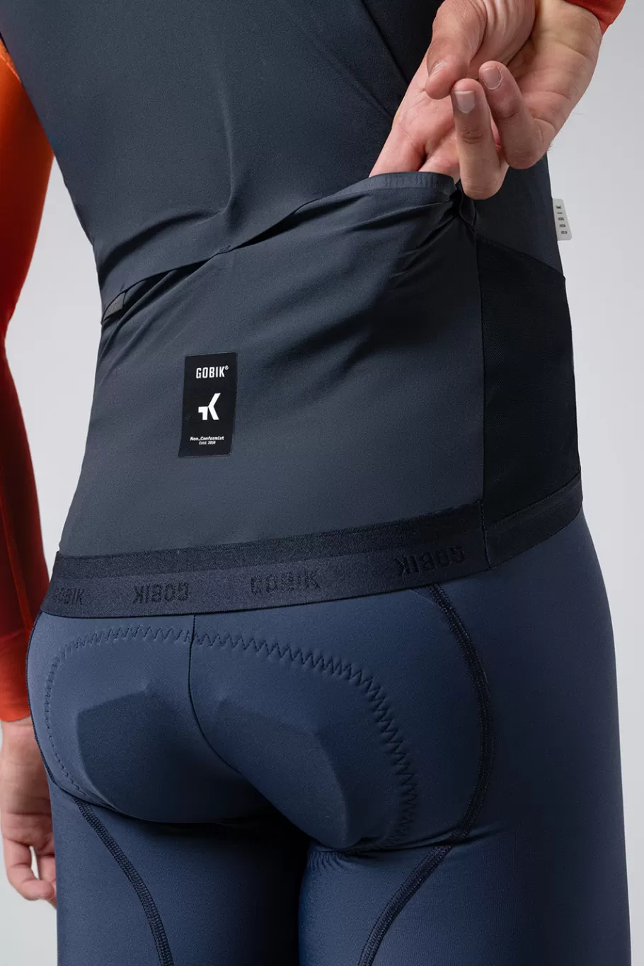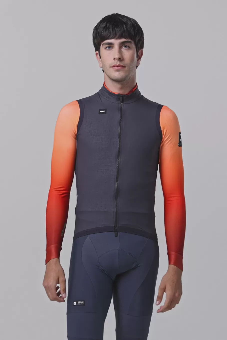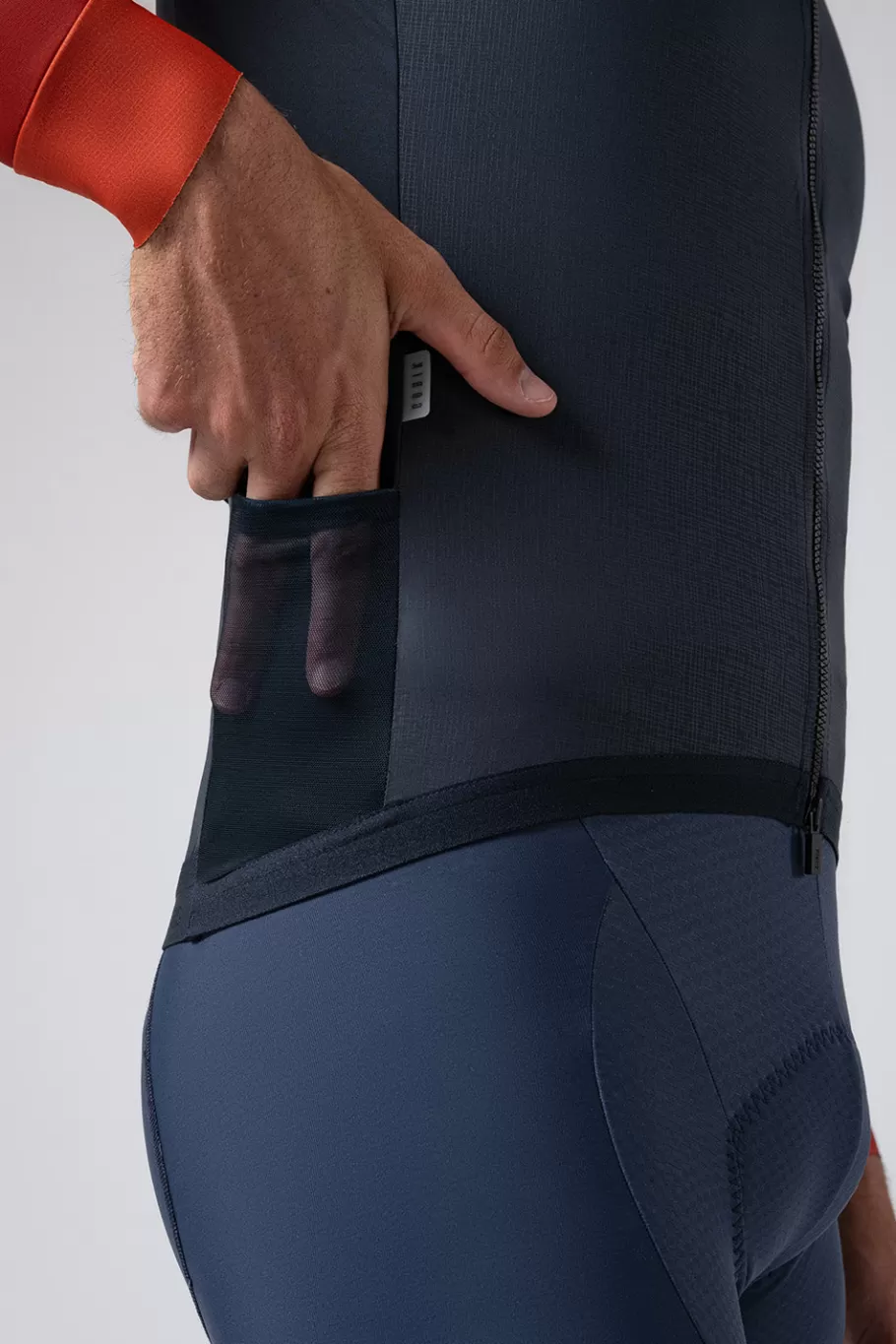 Ultraleicht und faltbar, mit einem neuen optimierten Muster, das die Aerodynamik auf dem Fahrrad verbessert. Es kombiniert Nylon und Elastan-Gewebe, die wirksamen Schutz mit großer Anpassungsfähigkeit bieten, dank seiner optimalen Elastizität. Das Rückenteil besteht aus einem ultraleichten, elastischen Gewebe, das die Restwärme ableitet, wenn man die Intensität erhöht. Bei dieser neuen Entwicklung wurden die Öffnungen am Rücken neu gestaltet, um einen einfachen Zugang zu den Trikottaschen zu ermöglichen.