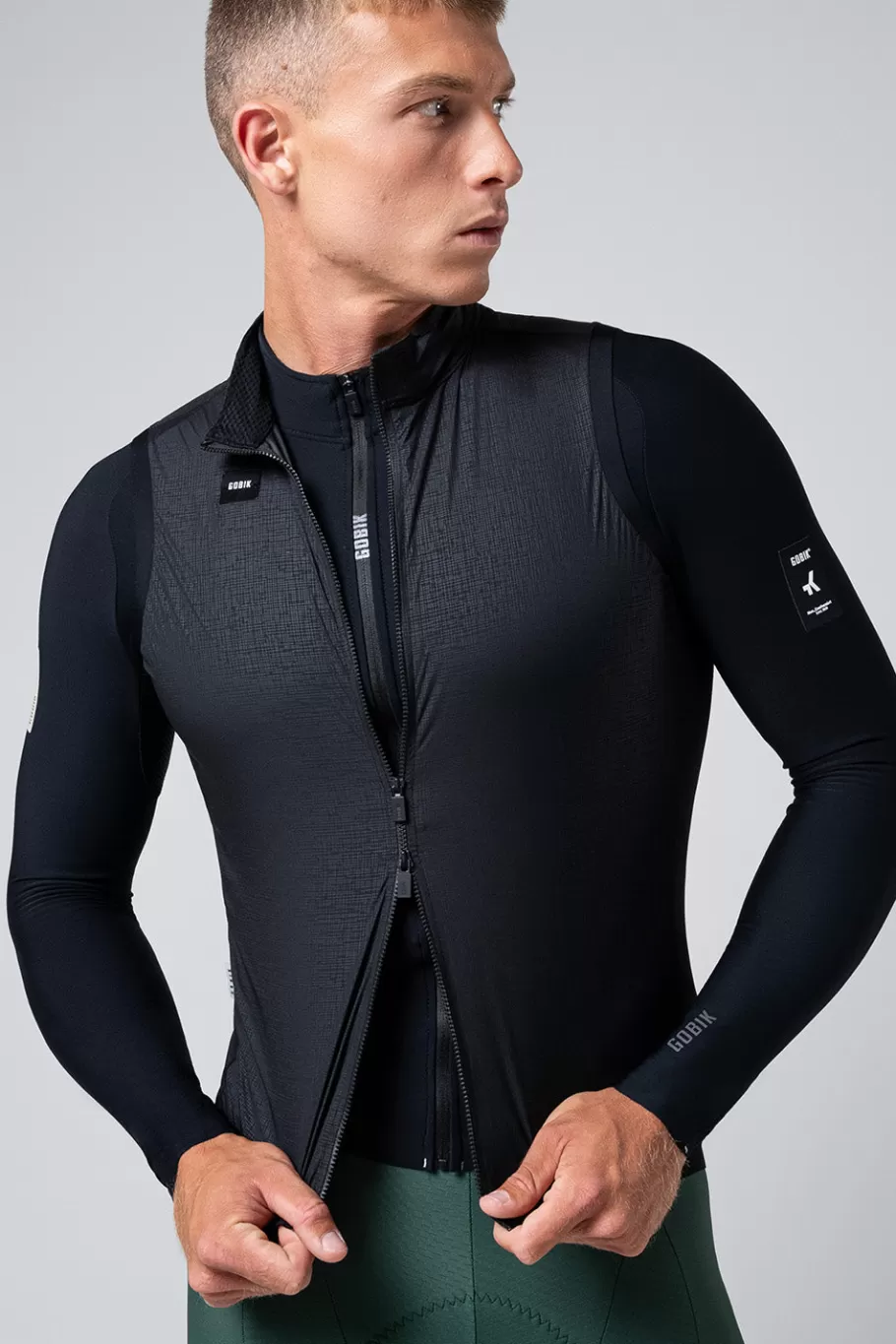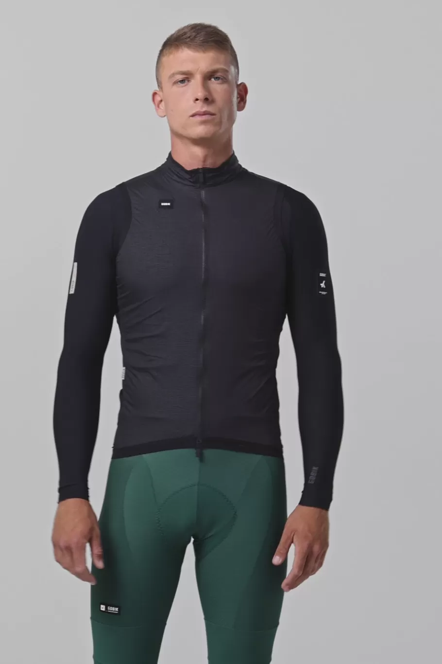 Ultraleicht und faltbar, mit einem neuen optimierten Muster, das die Aerodynamik auf dem Fahrrad verbessert. Es kombiniert Nylon und Elastan-Gewebe, die wirksamen Schutz mit großer Anpassungsfähigkeit bieten, dank seiner optimalen Elastizität. Das Rückenteil besteht aus einem ultraleichten, elastischen Gewebe, das die Restwärme ableitet, wenn man die Intensität erhöht. Bei dieser neuen Entwicklung wurden die Öffnungen am Rücken neu gestaltet, um einen einfachen Zugang zu den Trikottaschen zu ermöglichen.