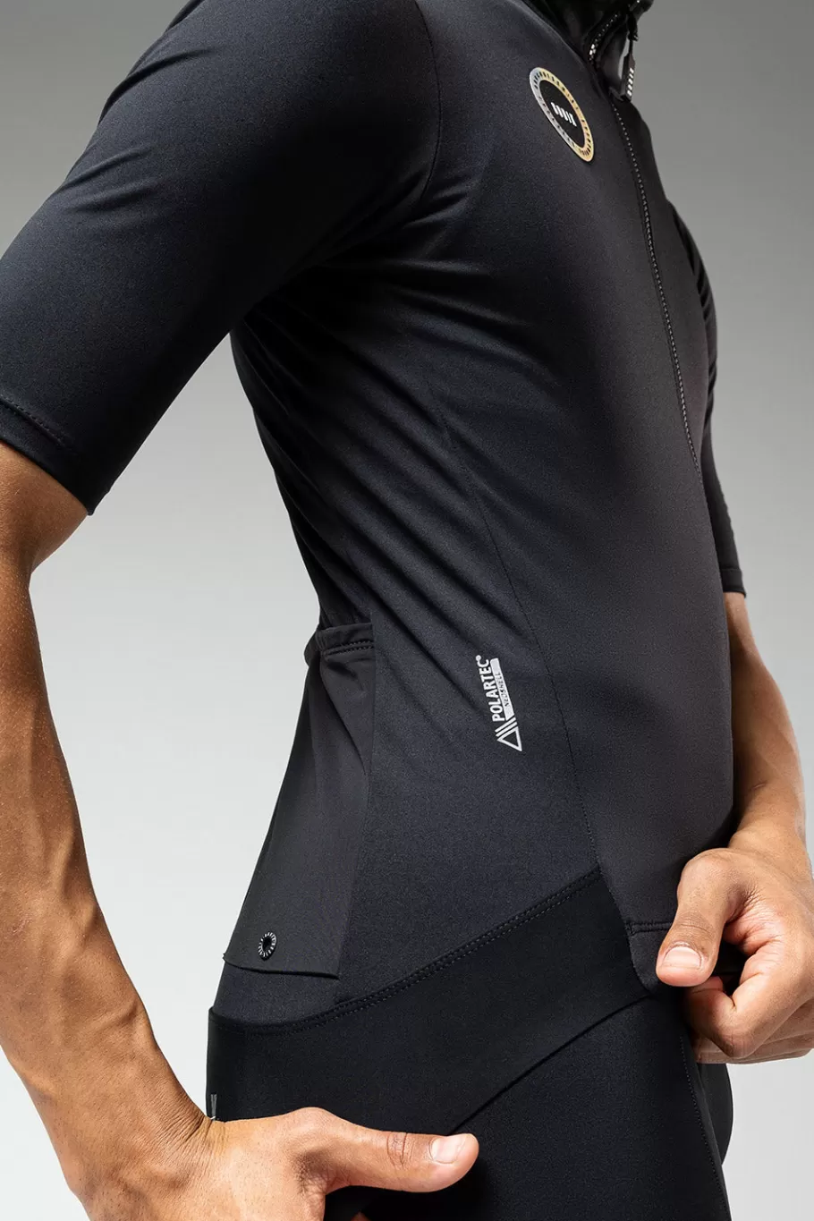 Wasserdicht und aerodynamisch. Mit Polartec® NeoShell®-Isolierung und Luftaustausch-Technologie. Eine äußere Schicht, die Sie sehr effektiv vor Regen und Wind schützt, mit vorbildlicher Atmungsaktivität, egal ob Sie in einem hohen oder entspannten Tempo fahren. Kurzärmelige Version für den Einsatz mit Ärmeln bei anspruchsvollen Wettkämpfen.
